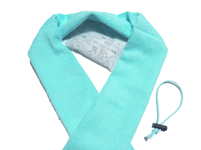 中央部分に保冷剤を入れることができ、首に掛けるとひんやりします。