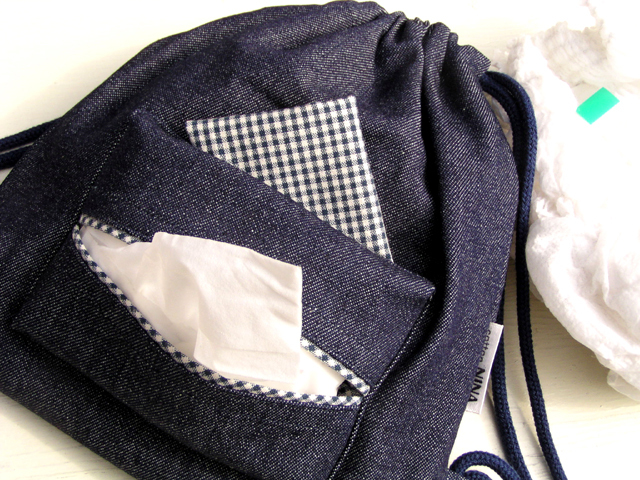 何かとティッシュが必要な、小さなお子様のためにナップの表側にポケットを兼ねたティッシュ入れをお付けしました。